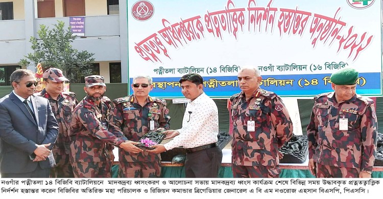নওগাঁর ধামইরহাটে মাদকদ্রব্য ধ্বংসকরণ ও আলোচনা সভা অনুষ্ঠিত হয়েছে। ২৯ নভেম্বর বেলা ১১ টায় ১৪ বিজিবির পত্নীতলা ব্যাটালিয়ন সদরে পত্নীতলার ১৪ ও নওগাঁ সদরের ১৬ বিজিবির যৌথ উদ্যোগে ২০১৯ সালের ১ অক্টোবর হতে চলতি বছরের ৩১ অক্টোবর পর্যন্ত ৬ হাজার ৫০১ বোতল মদ, ২৪ হাজার ২০৫ বোতল ফেন্সিডিল, ১৭৮ কেজি গাঁজা, ইয়াবা ৯০৯ পিস, নিষিদ্ধ ট্যাবলেট ৫ হাজার ৫৪৬ পিস, নেশাজাতীয় সিরাপ ১০ হাজার ৮০৬ বোতল, নেশাজাতীয় ইনজেকশন ১১ হাজার ৮৪৮ পিসসহ হেরোইন, গুড়া তামাক পাতার বিড়ি ও টেন্ডু বিড়ির পাতা সহ মোট ২ কোটি ৯০ লাখ ৮ হাজার টাকা মুল্যের মাদকদ্রব্য ধ্বংস করা হয়। অনুষ্ঠানে প্রধান অতিথি হিসেবে উপস্থিত ছিলেন বিজিবির অতিরিক্ত মহাপরিচালক ও রংপুর বিজিবির রিজিয়ন কমান্ডার ব্রিগেডিয়ার জেনারেল এ বি এম নওরোজ এহসান বিএসপি, পিএসসি। বিশেষ অতিথি হিসেবে উপস্থিত ছিলেন রাজশাহী বিজিবির সেক্টর কমান্ডার ও উপ মহাপরিচালক কর্নেল মোঃ আনোয়ার লতিফ খান বিপিএম(বার) পিএসসি, নওগাঁ জেলা প্রশাসক মোঃ খালিদ মেহেদী হাসান পিএএ, পুলিশ সুপার রাশেদুল হক, অতিরিক্ত পুলিশ সুপার আফতাব উদ্দিন,নওগাঁ মাদকদ্রব্য নিয়ন্ত্রণ অধিদফতরের সহকারী পরিচালক লোকমান হোসেন, ১৪ বিজিবির অধিনায়ক লেফটেন্যান্ট কর্নেল হামিদ উদ্দিন পিএসসি, ১৬ বিজিবির অধিনায়ক লেঃ কর্ণেল মোহাম্মদ আসাদুজ্জামান, পিএসসি, জি, জেলা সিভিল সার্জন ডাঃ আবু হেনা মোহাম্মদ রায়হানুজ্জামান সরকার, জেলা প্রেস ক্লাব সভাপতি কায়েস উদ্দিনসহ প্রশাসনের উধ্বর্তন কর্মকর্তাবৃন্দ, স্থানীয় গন্যমান্য ব্যক্তিবর্গ, স্কুল কলেজের শিক্ষক-শিক্ষিকা-ছাত্র-ছাত্রী এবং প্রিন্ট ও ইলেকট্রনিক্স মিডিয়ার সাংবাদিকবৃন্দ। পরে ১৪ বিজিবি কর্তৃক গত ০৫ মার্চ ২০১৪ হতে ৩১ অক্টোবর ২০২২ পর্যন্ত নওগাঁ জেলার বিভিন্ন স্থান হতে উদ্ধারকৃত কষ্টি পাথরের ০৫টি মূর্তি এবং নওগাঁ ব্যাটালিয়ন (১৬ বিজিবি) কর্তৃক নওগাঁ জেলার বিভিন্ন স্থান হতে উদ্ধারকৃত ০৬টি কষ্টি পাথরের এবং ০৩ টি সিমেন্টের মূর্তি নওগাঁ জেলার বদলগাছি উপজেলার পাহাড়পুর প্রত্নতাত্ত্বিক জাদুঘরে সংরক্ষণের নিমিত্তে কাস্টোডিয়ান, পাহাড়পুর জাদুঘর, নওগাঁ এর নিকট হস্তান্তর করা হয়।