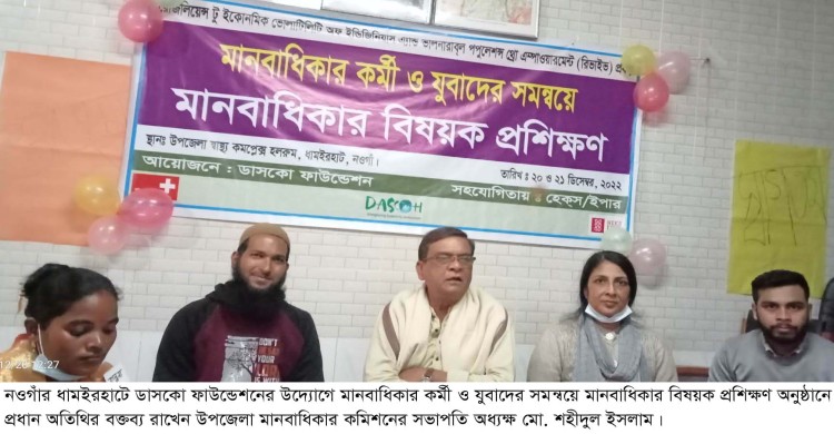 নওগাঁর ধামইরহাটে মানবাধিকারকর্মী ও যুবাদের সমন্বয়ে দুই দিন ব্যাপী মানবাধিকার বিষয়ক প্রশিক্ষণ অনুষ্ঠিত হয়েছে। ২০ ও ২১ ডিসেম্বর দুই দিন ব্যাপী বেসরকারী উন্নয়ন সংস্থা ডাসকো ফাউন্ডেশনে আয়োজনে ও দাতা সংস্থা হেকস,/ইপার এর সহযোগিতায় উপজেলা স্বাস্থ্য কমপ্লেক্সের হলরুমে মানবাধিকার কর্মী ও যুবাদের সমন্বয়ে মানবাধিকার বিষয়ক প্রশিক্ষণ অনুষ্ঠিত হয়। প্রশিক্ষণ কর্মসূচিতে প্রধান অতিথির বক্তব্য রাখেন ধামইরহাট উপজেলা মানবাধিকার কমিশনের সভাপতি ও সরকারি এম এম কলেজের প্রাক্তন অধ্যক্ষ অধ্যাপক মো. শহীদুল ইসলাম বলেন, ‘ মানবাধিকার হলো মানুষের অধিকার, যা নিজেকে নিজের অধিকার ও দায়িত্ব সম্পর্কে বোঝাকে সহযোগিতা করে। ডাসকো ফাউন্ডেশনের উপজেলা কর্মকর্তা রওনক লায়লা’র সভাপতিত্বে অনুষ্ঠানে অন্যান্যের মধ্যে বিশেষ বক্তা মেডিকেল অফিসার (ডিজিস কন্ট্রোল) ডা.মোঃ নিয়াজ মোস্তাক চৌধুরী, কমিউনিটি ডেভেলপমেন্ট অফিসার তোফাজ্জল হোসেন, প্রজেক্ট অফিসার আনোয়ার হোসেন, মোঃ রাসেল হোসেন, প্রিয়াংঙ্কা সাহা সাংবাদিক সুফল চন্দ্র প্রমুখ উপস্থিত ছিলেন। ২য় দিনে ফৌজদারী ও দেওয়ানী অপরাধ সম্পর্কে বিভিন্ন দিক নির্দেশনামুলক ও জ্ঞানগর্ব আলোকপাত করেন ধামইরহাট থানার অফিসার ইনচার্জ (ওসি) মোজাম্মেল হক কাজী। তিনি মাদক, বাল্য বিবাহ, যৌতুক বিরোধী স্লোগান ও এসবের কুফল সম্পর্কে উপস্থিত যুবাদের সাথে মত বিনিময় করেন এবং এমন আয়োজনের জন্য ডাসকো ফাউন্ডেশনের ভূয়সী প্রশংসা করেন।